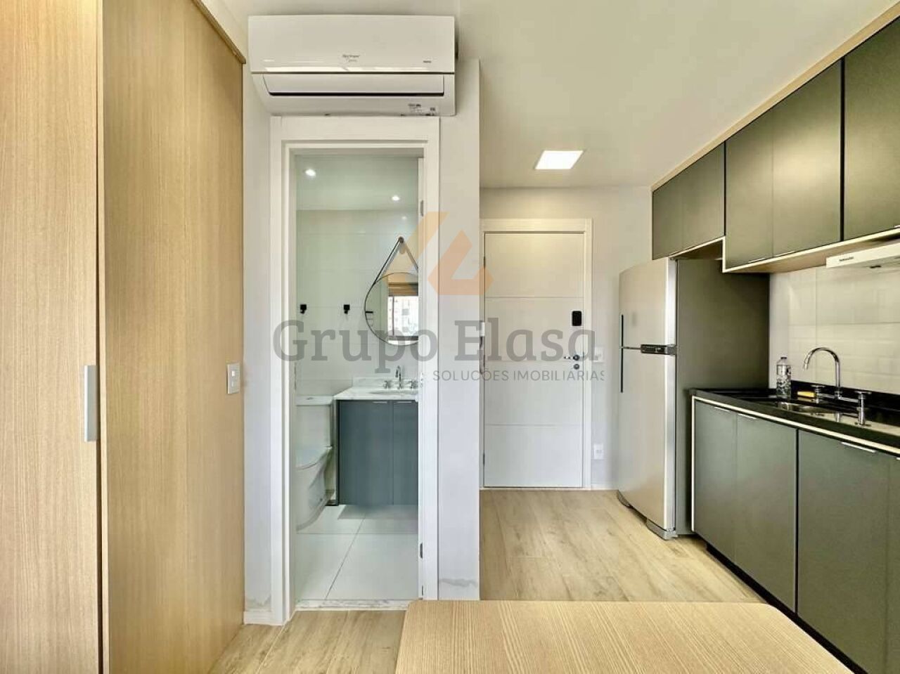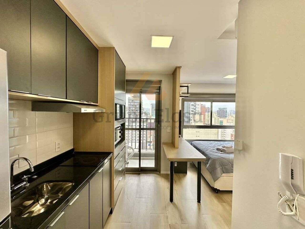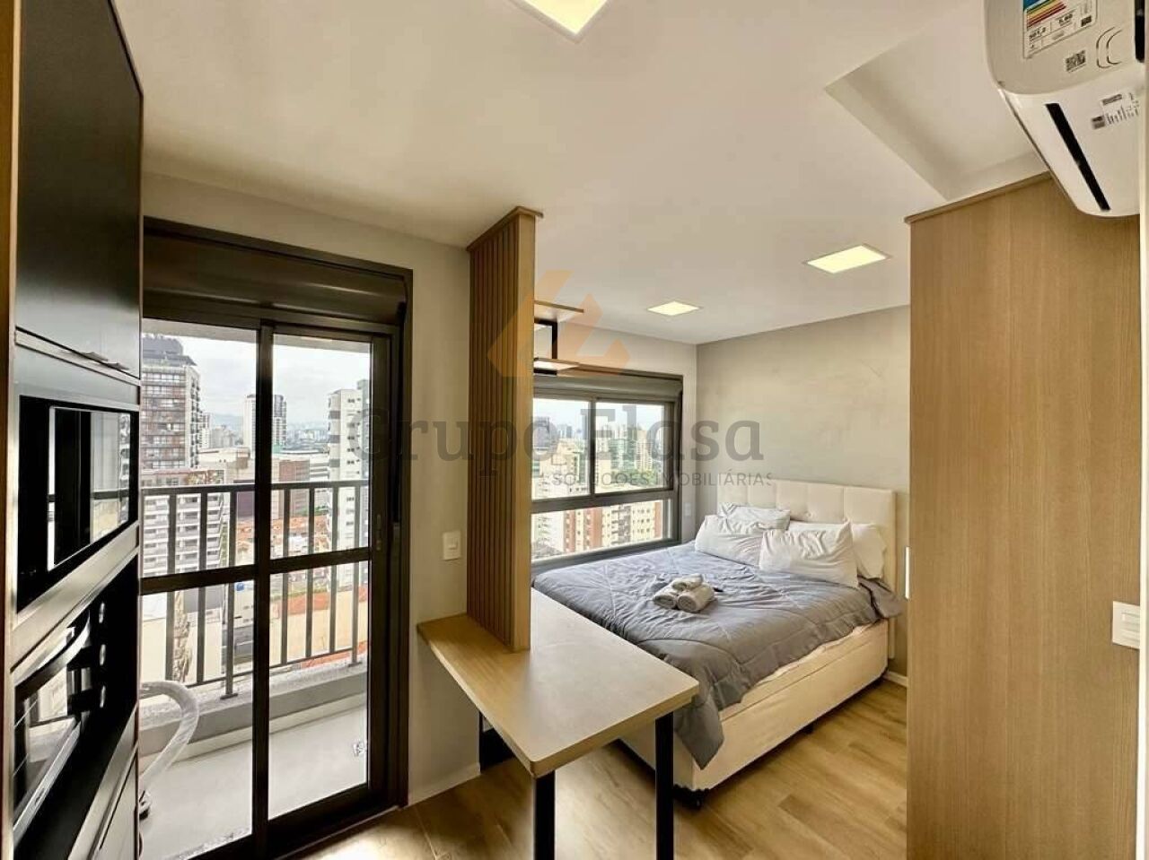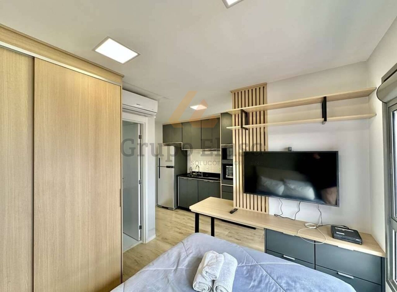 Studio pronto para morar, totalmente mobiliado e equipado com acabamento funcional e decoração contemporânea. Cozinha completa com fogão de indução, depurador, forno elétrico, micro-ondas e geladeira; varanda anexa à cozinha proporcionando iluminação e ventilação natural. Área íntima com cama box, cabeceira com tomada USB, escrivaninha, guarda-roupas de 2 portas e TV LED 48". Banheiro com box de vidro, espelho e gabinete sob a pia. Conforto com ar-condicionado split e fechadura eletrônica.