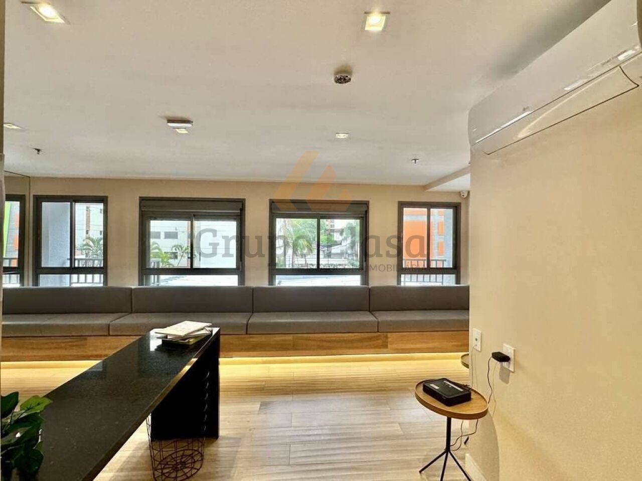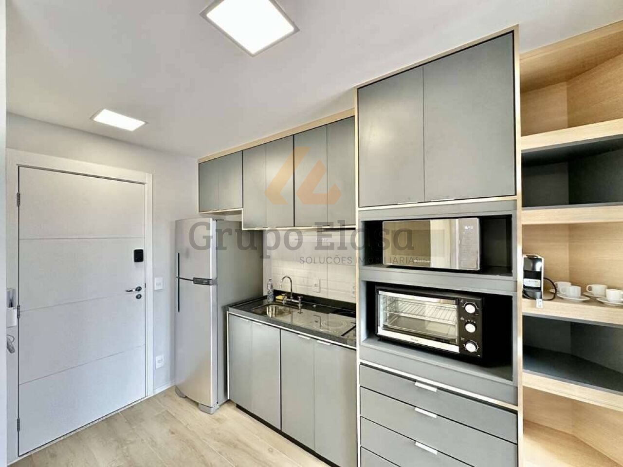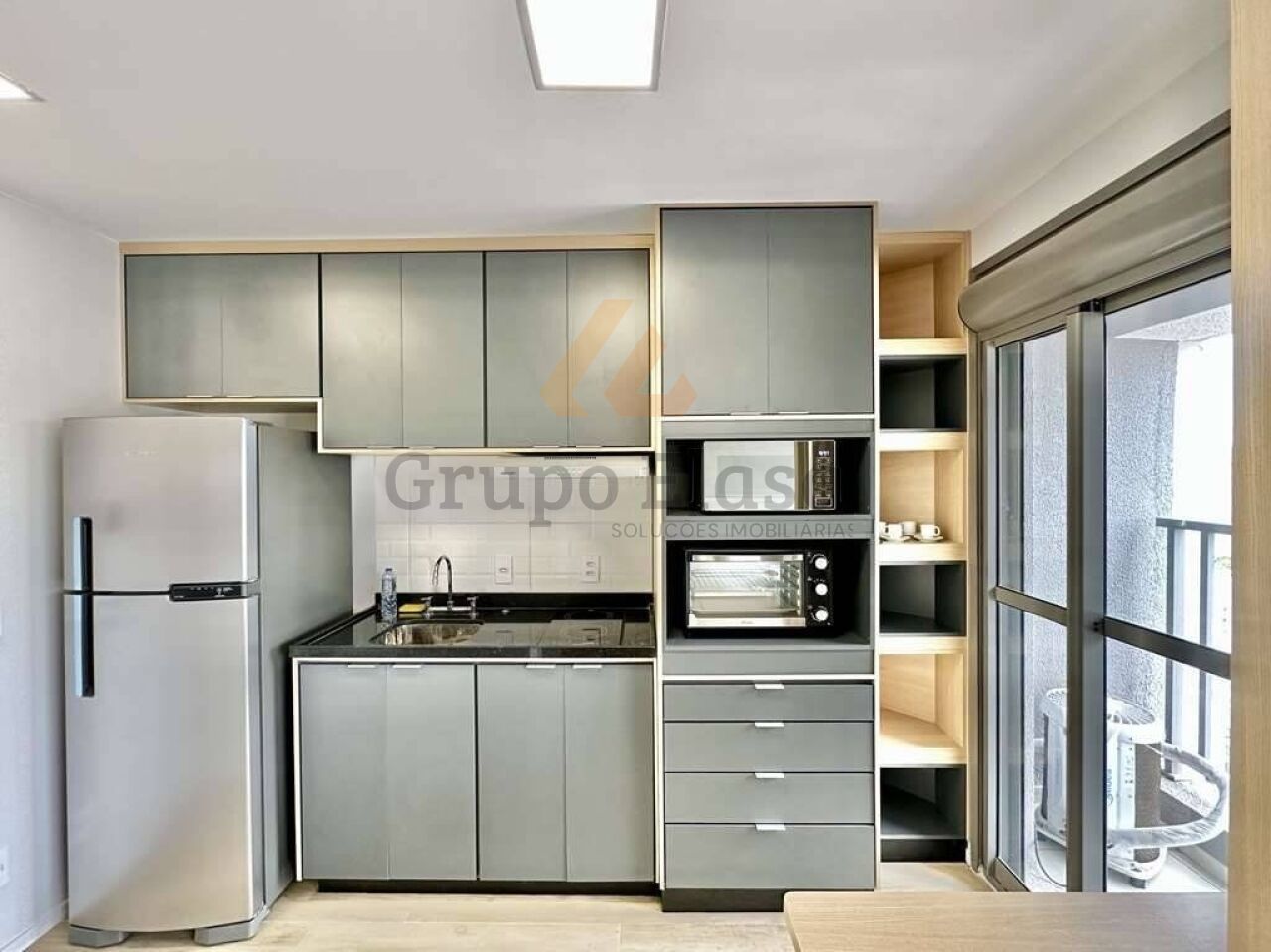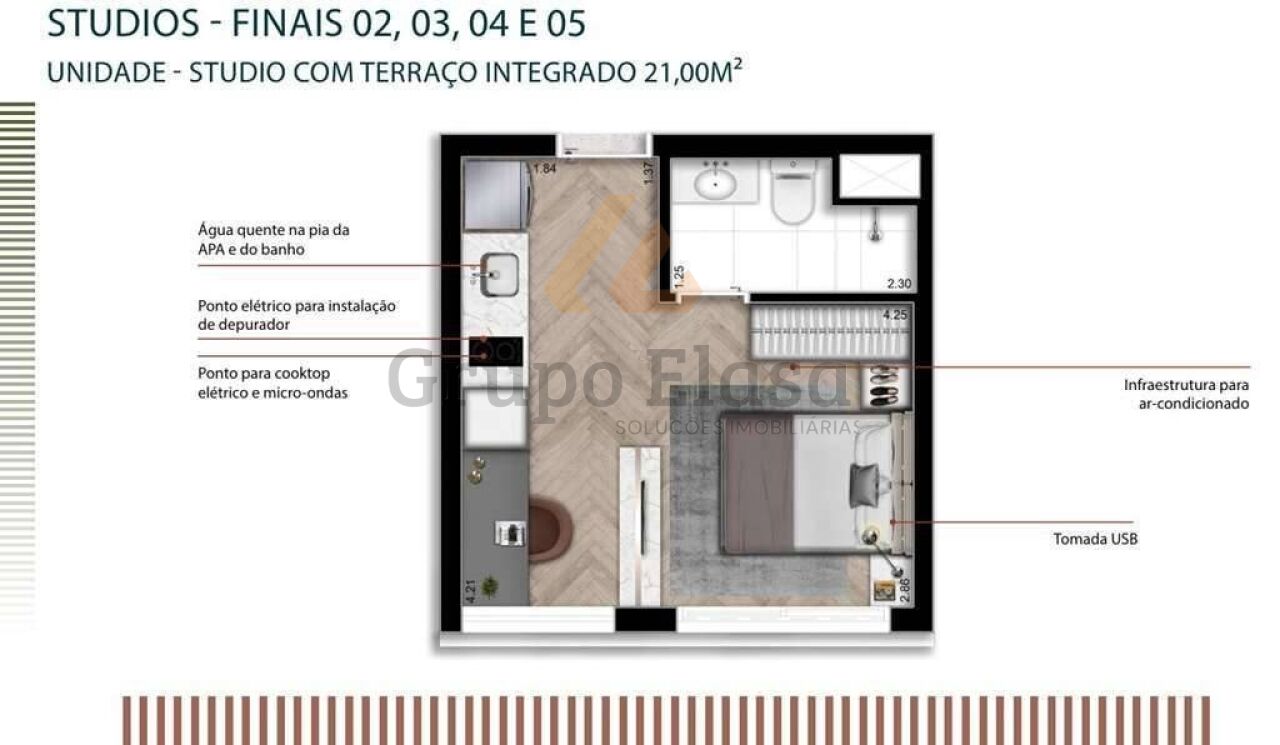 Studio pronto para morar, totalmente mobiliado e equipado com acabamento funcional e decoração contemporânea. Cozinha completa com fogão de indução, depurador, forno elétrico, micro-ondas e geladeira; varanda anexa à cozinha proporcionando iluminação e ventilação natural. Área íntima com cama box, cabeceira com tomada USB, escrivaninha, guarda-roupas de 2 portas e TV LED 48". Banheiro com box de vidro, espelho e gabinete sob a pia. Conforto com ar-condicionado split e fechadura eletrônica.