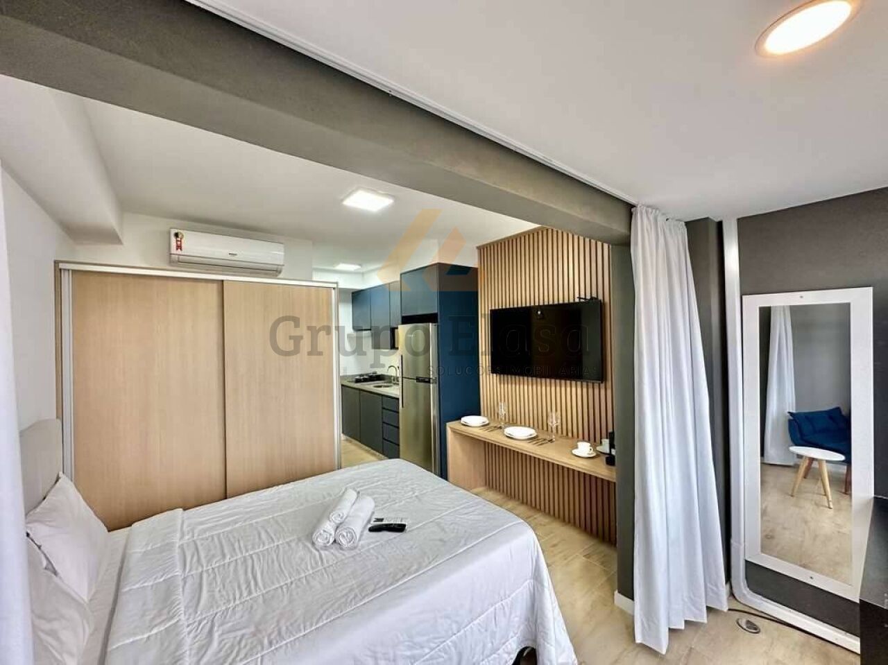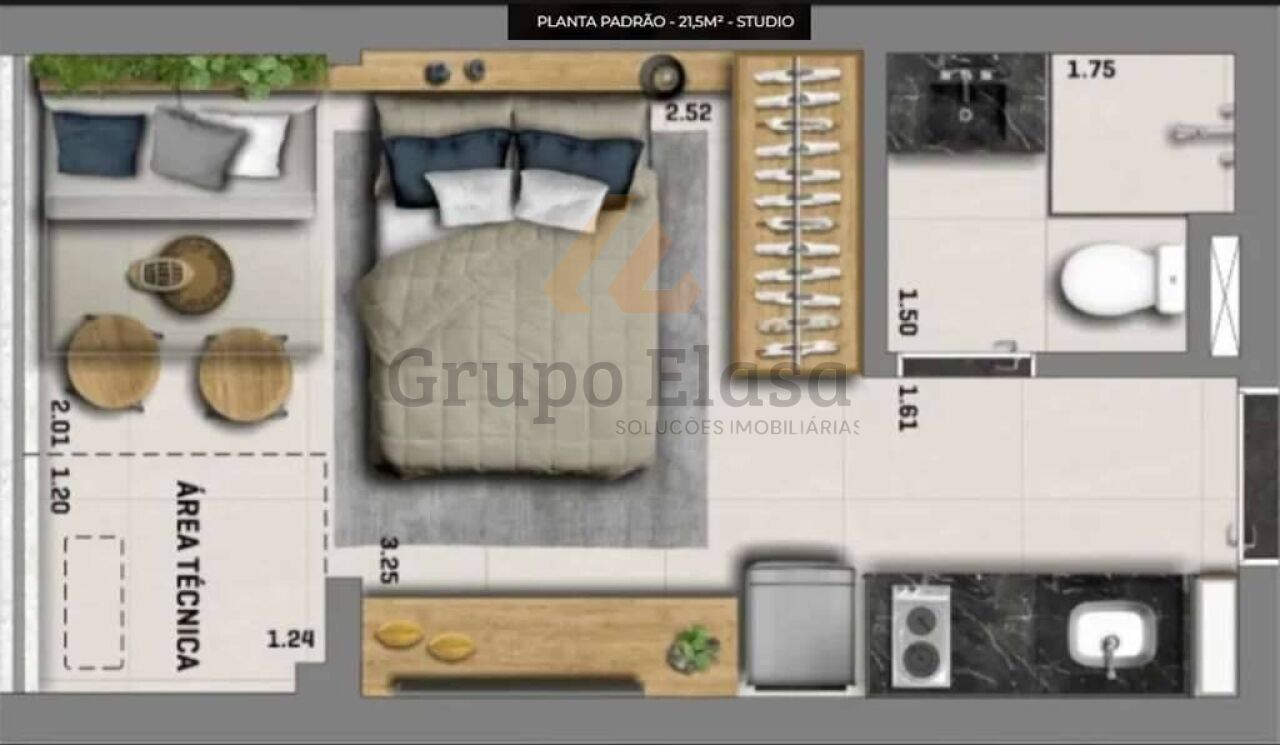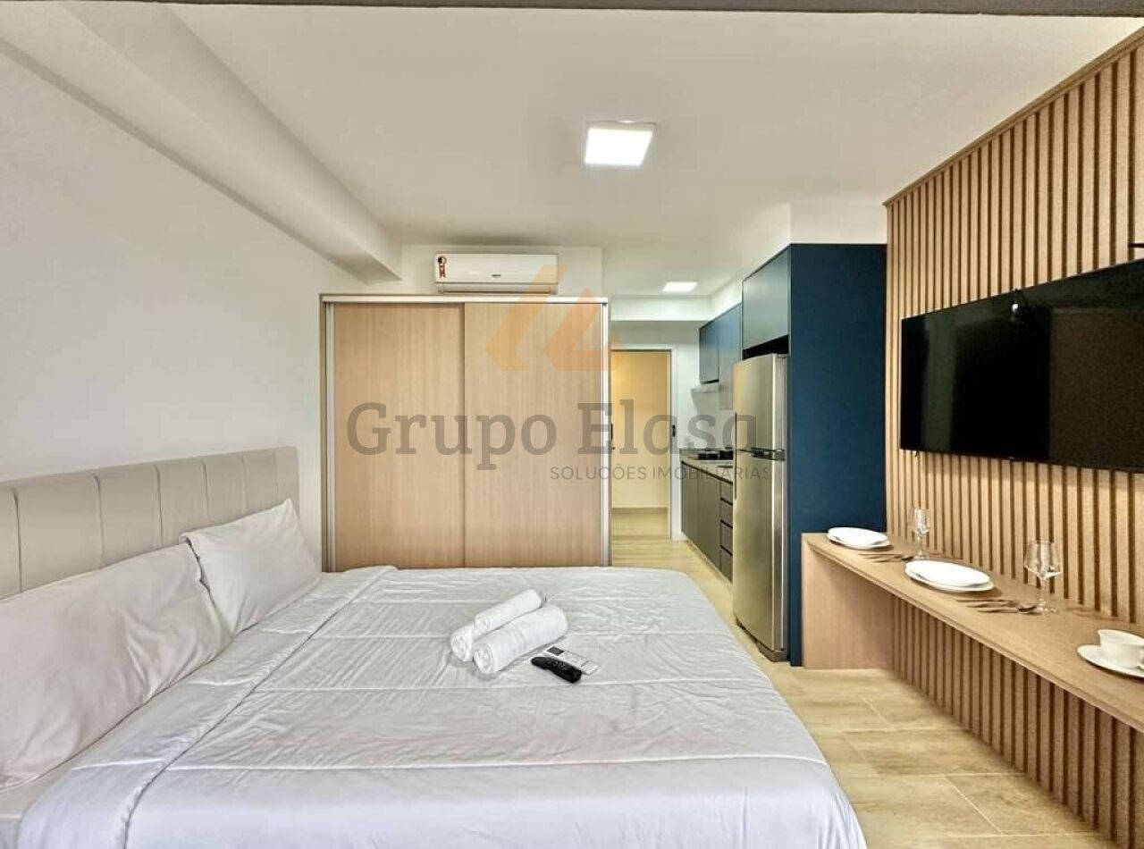 Charmoso e funcional, este studio compacto foi planejado para oferecer conforto e praticidade desde o primeiro instante. Ambientes integrados com iluminação natural abundante, acabamento moderno e paleta neutra que amplia a sensação de espaço. Mobiliado com sofá-cama, cama com gavetas, armário embutido, escrivaninha multipurpose e mesa de jantar retrátil ? tudo otimizado para aproveitar cada centímetro. Cozinha americana equipada com torre de eletrodomésticos (geladeira, cooktop, micro-ondas), bancada em pedra, armários planejados e área de serviço compacta com máquina de lavar. Banheiro contemporâneo com box de vidro, revestimentos atuais e boa ventilação.